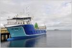 Heute kam das Schiff "Richard With", das bei der Einfahrt in den Hafen von Svolvaer gleich bei der Statue von Richard With vorbeifuhr.