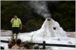Natürlich war das Wetter nicht mehr so prachtvoll wie gestern Abend, aber die Prognosen versprachen Aufhellungen im Verlauf des Tages. Mein erstes Ziel war ein geothermisches, nämlich der grosse Thermalpark Wai-o-Tapu, der fast zu den Pflichtbesuchen einer Neuseelandreise gehört. Dort gibt die Erde allerhand frei, zum Teil Hochgiftiges und viel Heisses. Die erste Station war aber der sich etwas ausserhalb des Parks befindliche Geysir Lady Knox, der jeden Tag um 09.30 Uhr ausbricht. Dass ein Geysir so exakt jeden Tag zur gleichen Zeit seine Fontäne versprüht, kann ja nicht ohne Nachhilfe passieren. In der Tat ist der Geysirausbruch eine inszenierte Angelegenheit. Im Halbrund sitzen die Zuschauer, einige mit Filmkameras auf den besten Plätzen in Bereitschaft, dann tritt der Mann auf, der einem vor wenigen Minuten noch den Parkplatz zugewiesen hatte. Er machte einige Erklärungen und schüttete dann eine Tüte Waschmittel in das Loch des Geysirs. Ein paar Minuten später begann es zu brodeln, dann zu sprühen. Es herrschte eine grosse Begeisterung am Anfang, dann ging es über in die Phase, wo mit dem Handy die Selfies gemacht wurden, dann kamen die Gruppenbilder, vornehmlich beliebt bei Indern und Chinesen, und dann verschwanden praktisch alle, obwohl der Geysir munter weiterspritzte. Ich machte meine Foto- und Filmaufnahmen und musste auf dem Parkplatz wenigstens mein Auto nicht suchen, schliesslich stand es fast allein da.