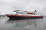 Obwohl ich bereits 07.15 mit dem Fotoapparat vor dem Hotel stand, war die Hurtigrute schon fast angekommen. Vermutlich wegen Rückenwind oder überhöhter Geschwindigkeit. Heute war - der Landesgegend entsprechend - das Schiff Finnmarken an der Reihe, 2002 gebaut und mit 138.5 m Länge fast das längste aller Hurtigrute-Schiffe. Dennoch wendete das Schiff in der schmalen Bucht sehr elegant.