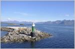 Bis zur Abfahrt der südwärts fahrenden Hurtigrute um 20.30 Uhr und zur Ankunft der nordwärts fahrenden Hurtigruteum 21.00 Uhr gab es Abendstimmung mit den Bergen der Insel Store Molla und der bronzernen, winkenden Fischersfrau am Hafeneingang.